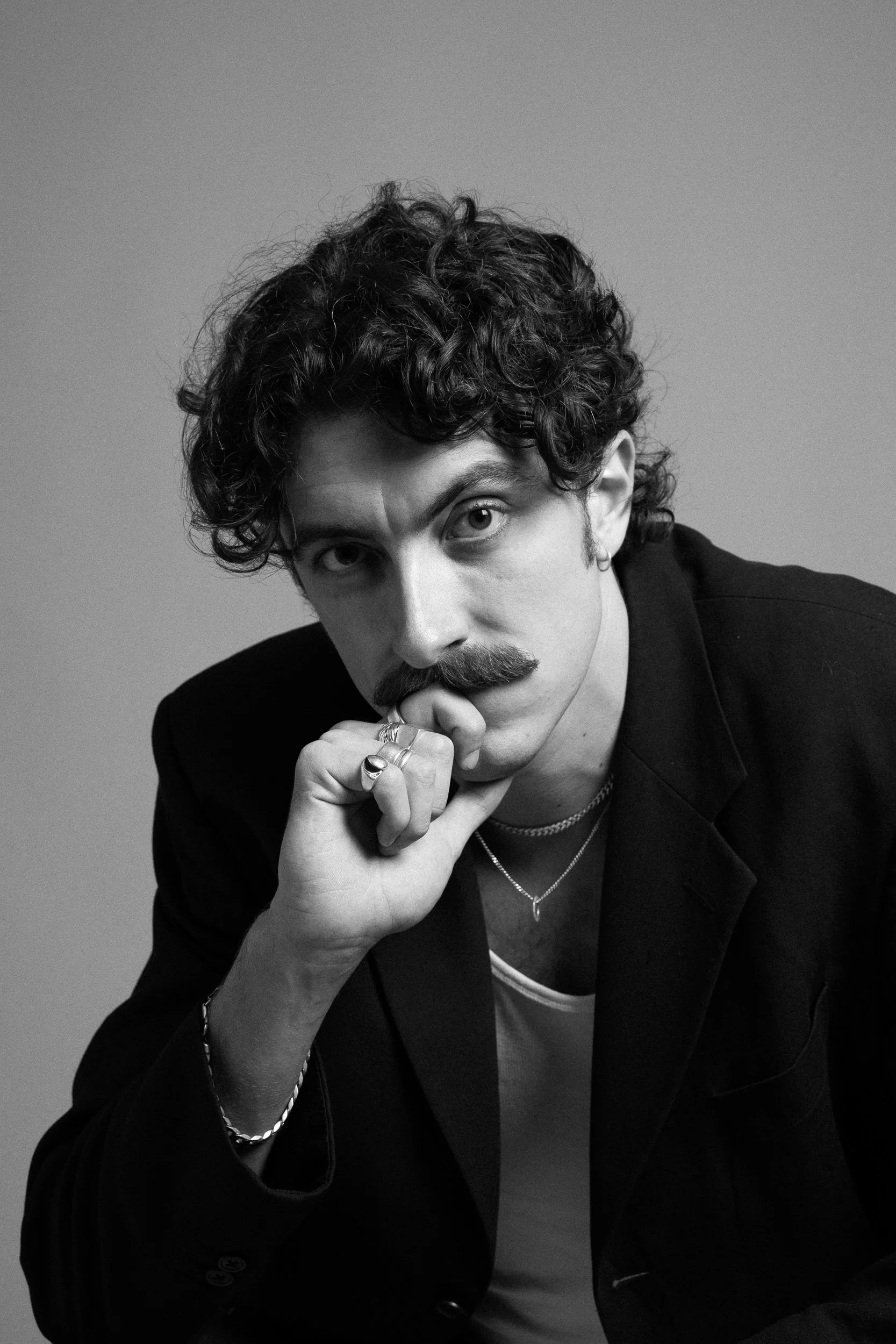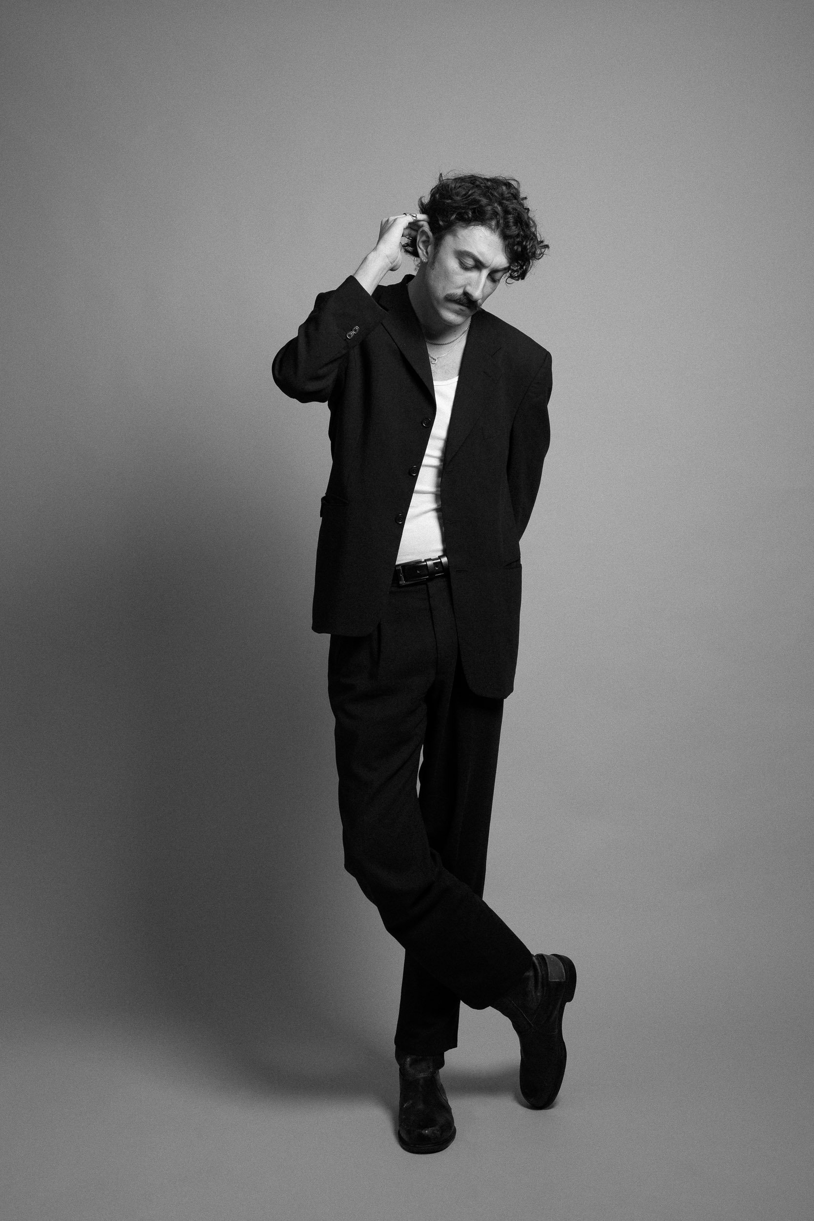 A man with curly hair and a mustache standing against a plain background in black and white. He is wearing a dark blazer, pants, and boots, with a white T-shirt underneath. He is touching his head with his right hand and looking down. View fullsize