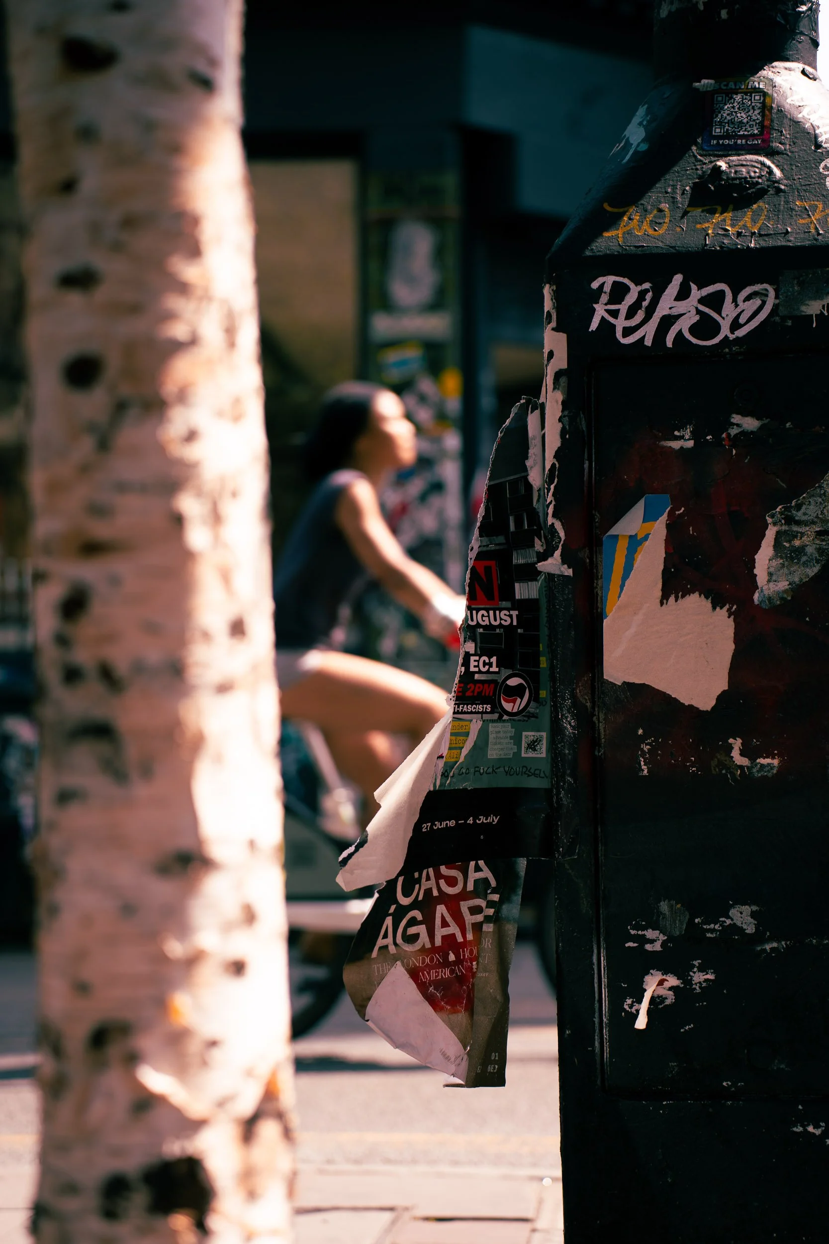 A woman riding a bicycle on a city street, partially obscured by a trash bin and a tree trunk in the foreground.