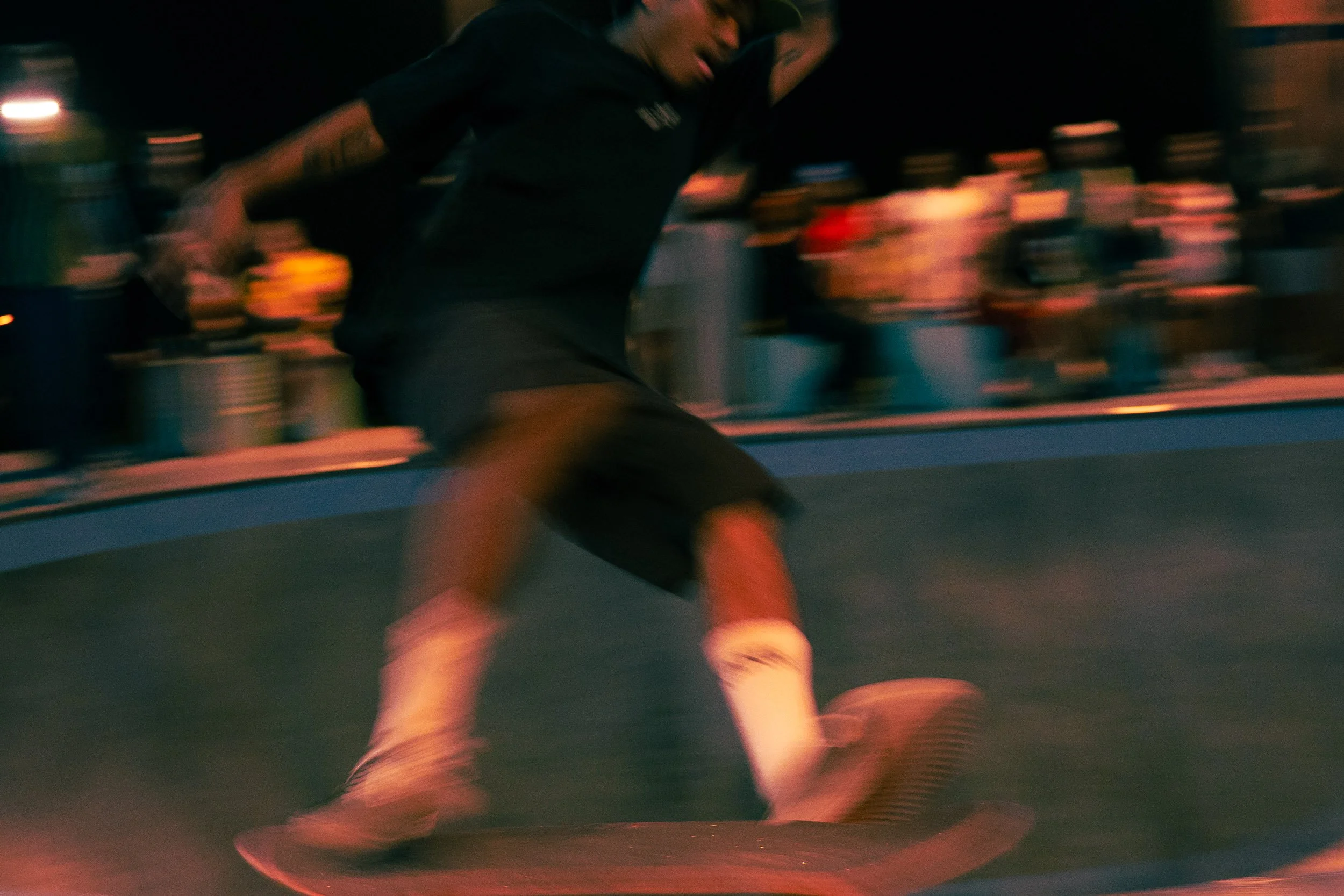 A young person with dark skin and short curly hair wearing a black shirt and teal pants, looking directly at the camera with a neutral expression.