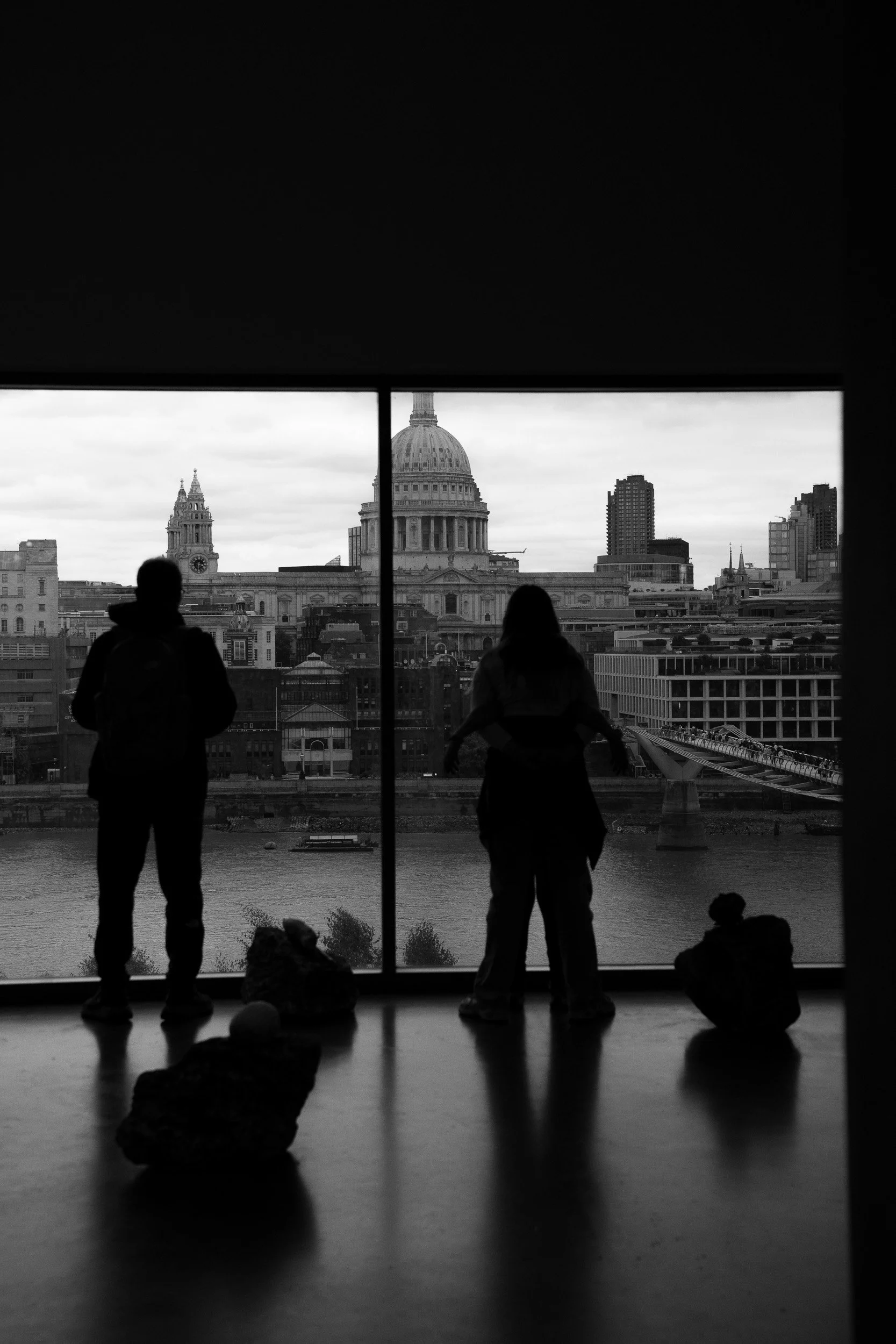 Silhouettes of two people looking out of a large window at the London skyline, featuring St. Paul's Cathedral, in black and white.