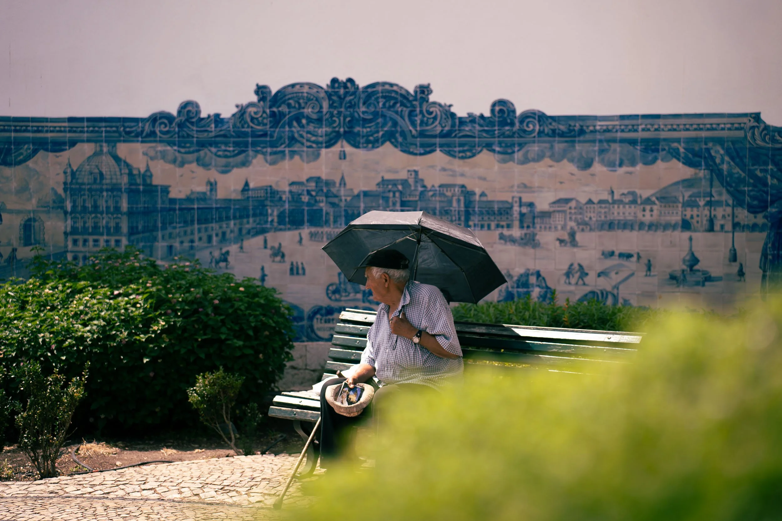 An elderly man sitting on a park bench holding an umbrella and a hat, with greenery and a large mural in the background.