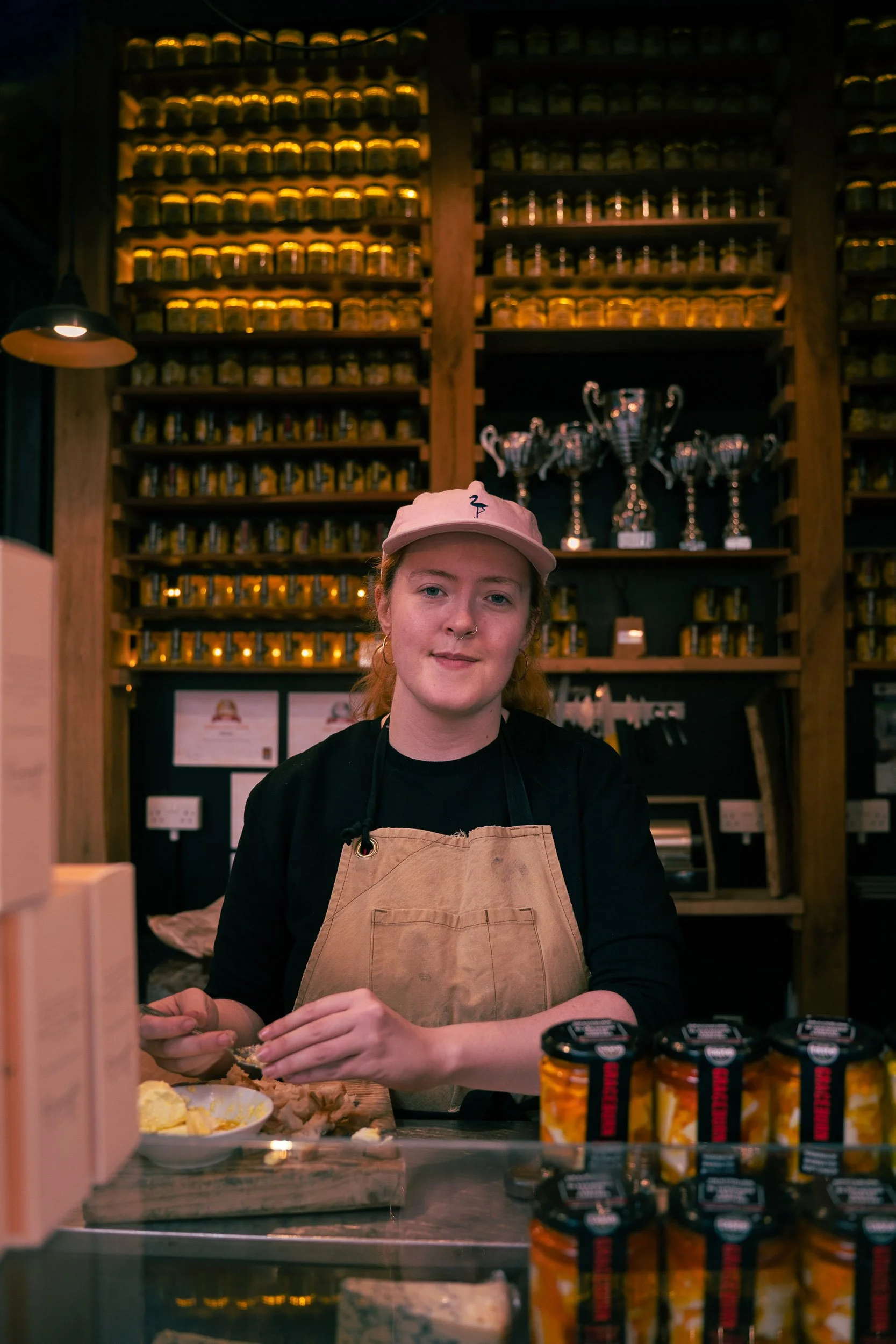 A young woman with red hair, wearing a pink cap and black shirt, is standing behind a counter with a beige apron. She is smiling slightly and holding a spoon, with a bowl of food in front of her. Behind her, there are shelves filled with jars, cups,