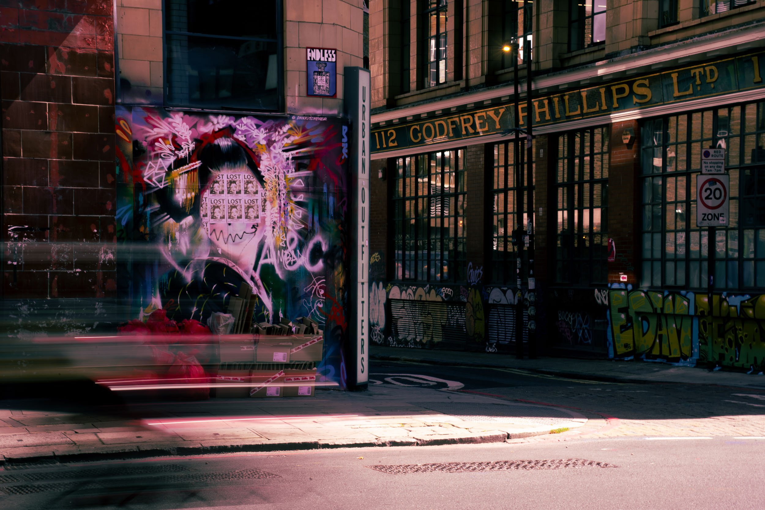 Urban street scene with graffiti art on the wall featuring a stylized face with 'LOST' written multiple times over the eyes and forehead, alongside graffiti text and tags. The location is marked as 112 Godfrey Phillips Ltd, with a bench and street si