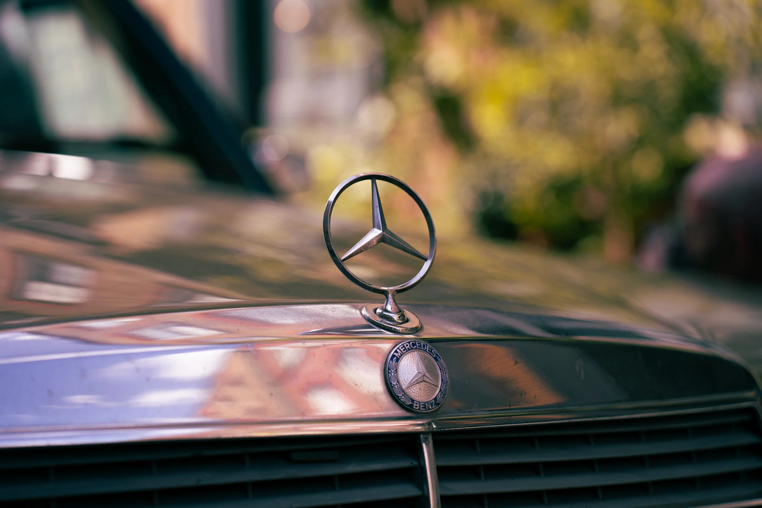 Close-up of a Mercedes-Benz hood ornament on a silver car with a blurred outdoor background.