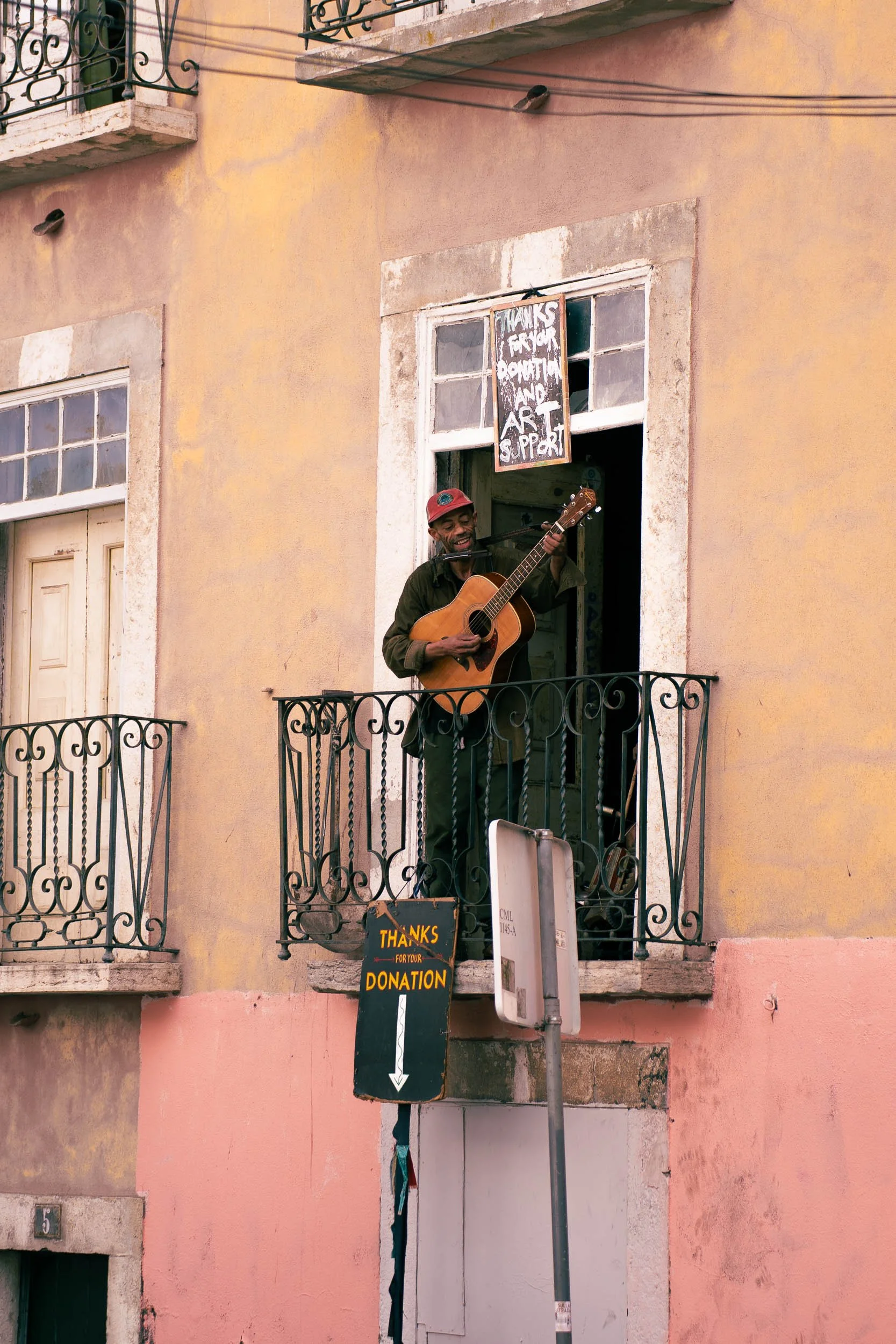 A man playing guitar and singing from a balcony of a colorful, weathered building. There are signs thanking donors and asking for donations.