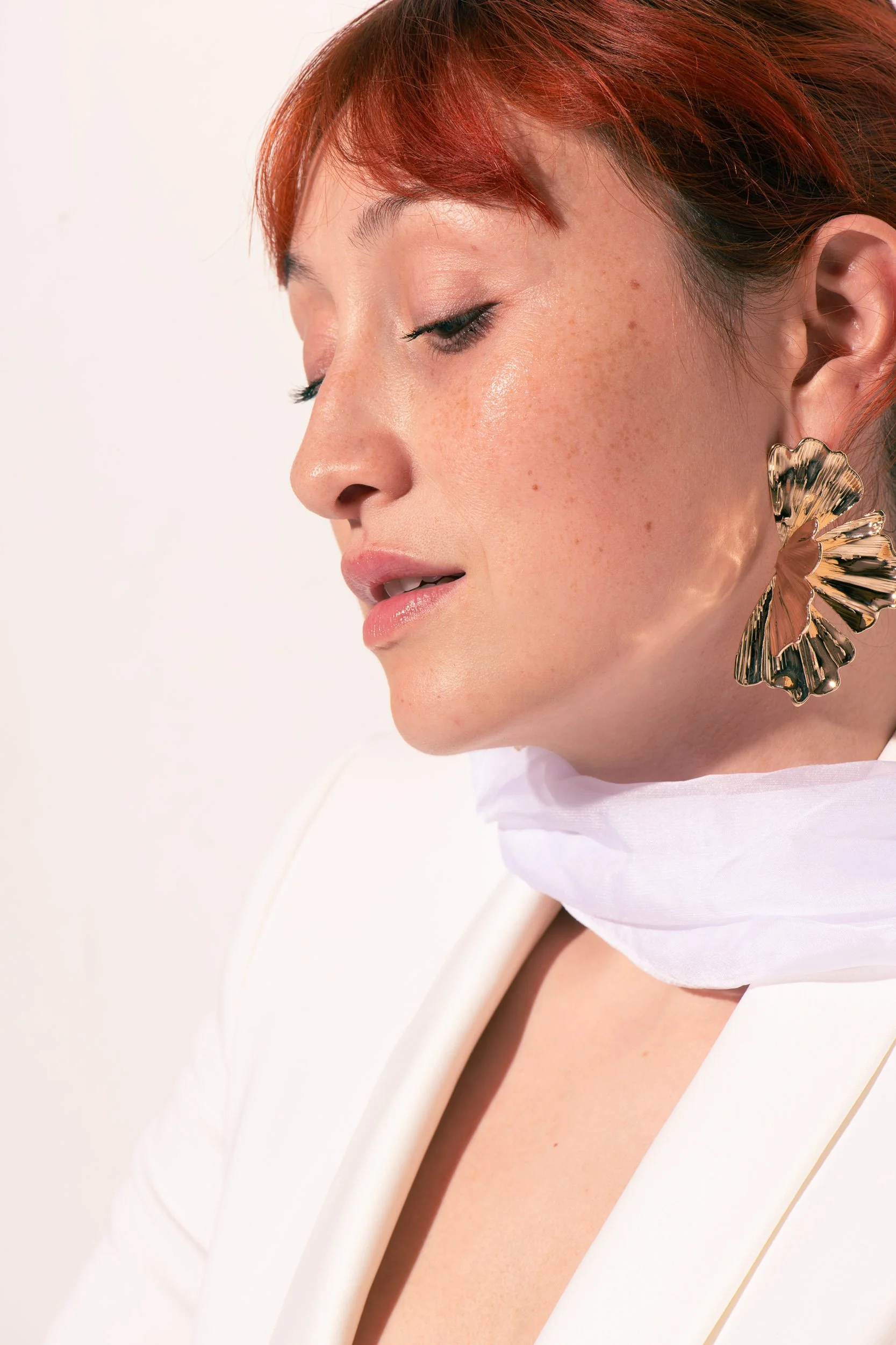 Black and white portrait of a man with curly hair, mustache, and earrings, wearing rings, necklaces, and a blazer, with a thoughtful expression, resting his chin on his hand. View fullsize